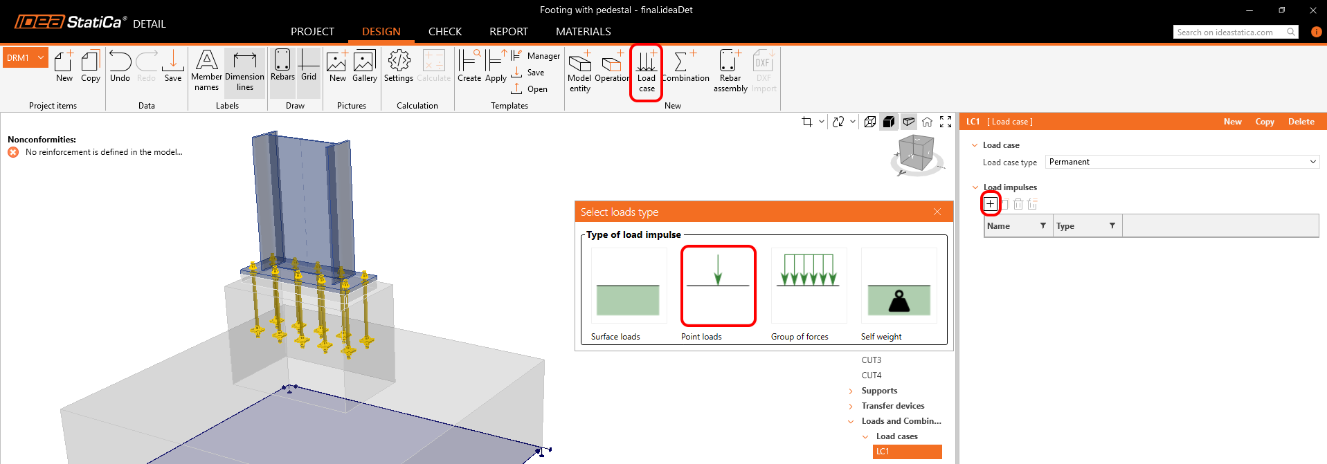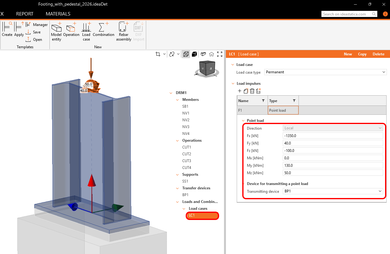 Concentrated forces are applied at the origin of the LCS location and transmitted via rigid elements to the member's end. As the steel component isn't evaluated in the 3D Detail, verify the member and base plate with IDEA StatiCa Connection or similar tools to avoid excessive loads on steel part. As the secondary load, assign the concrete block's Self-weight. Copy the entire load case