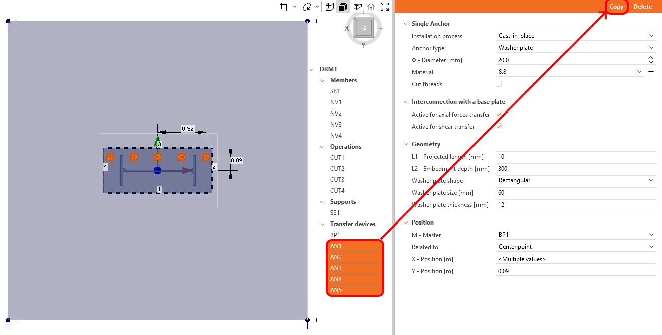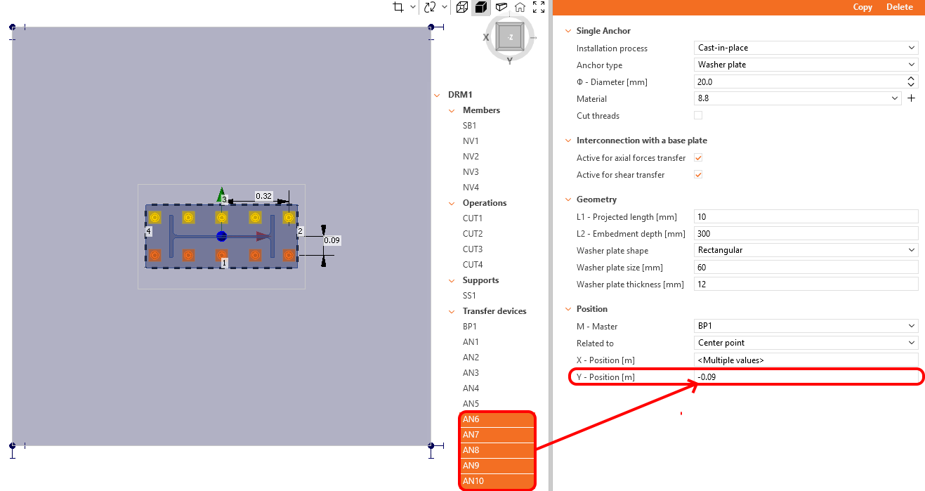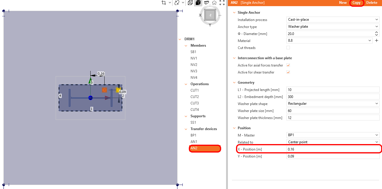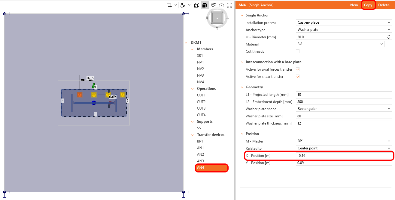 The Cast-in-place method, incorporating Washer plates at the end of the anchors, has been chosen. By default, the anchors are designed to transmit both tension and compression forces, as well as shear forces. The X and Y coordinates of the anchor set out accordingly.