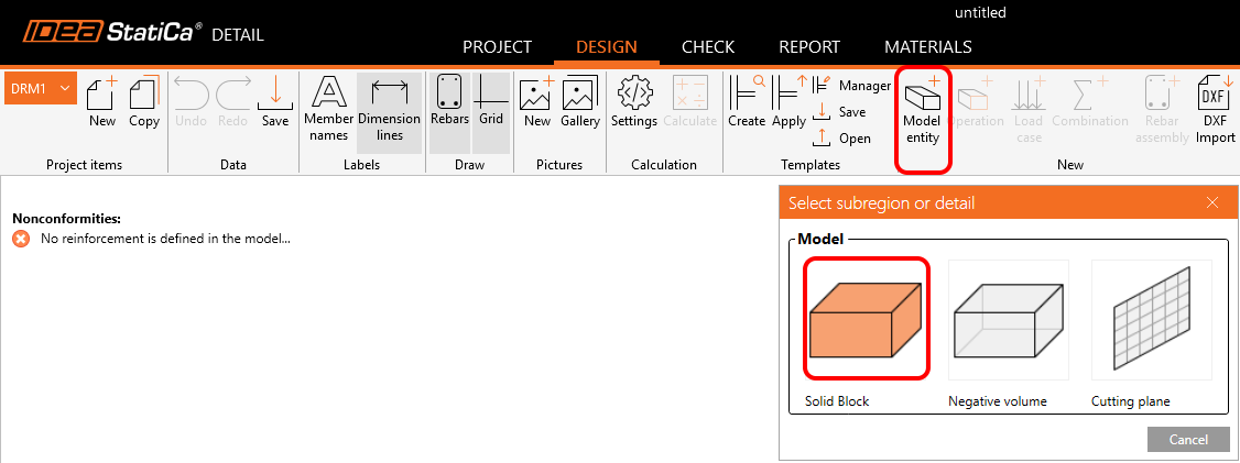 To start with modelling, you select Model Entity and Solid Block