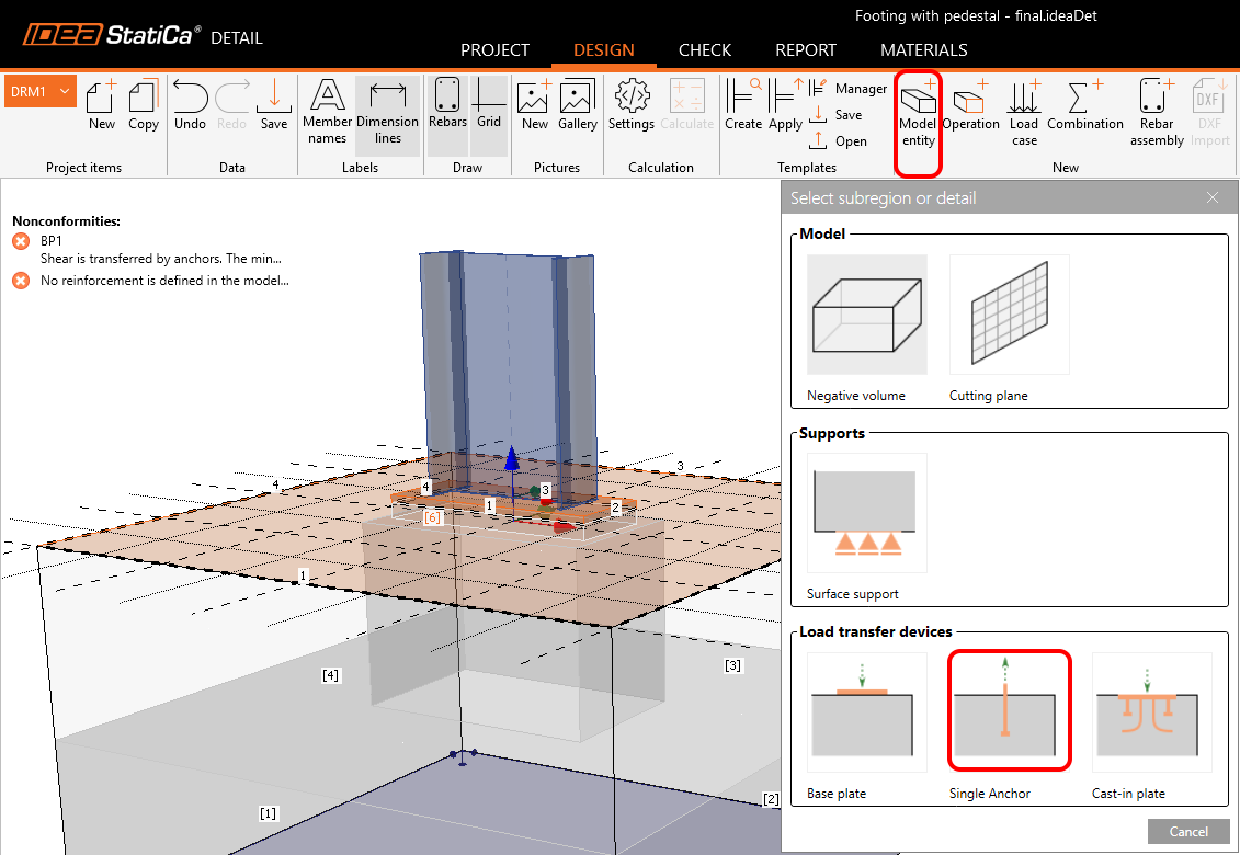 To connect the base plate and concrete part, you need to define the Single anchor and specify its properties.
