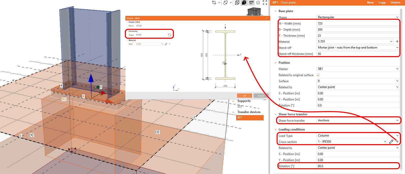 The base plate shall be securely positioned onto the Mortar joint, with nuts applied from both the top and bottom. The thickness of the layer is specified as 50 mm. Shear forces will be effectively transmitted through the anchors, while the column, an IPE 500 profile, is rotated 90 degrees around its local axis.