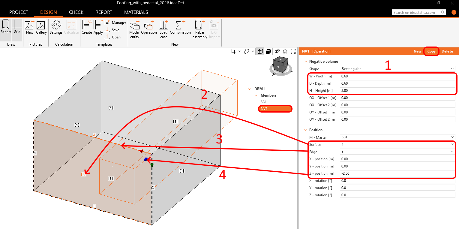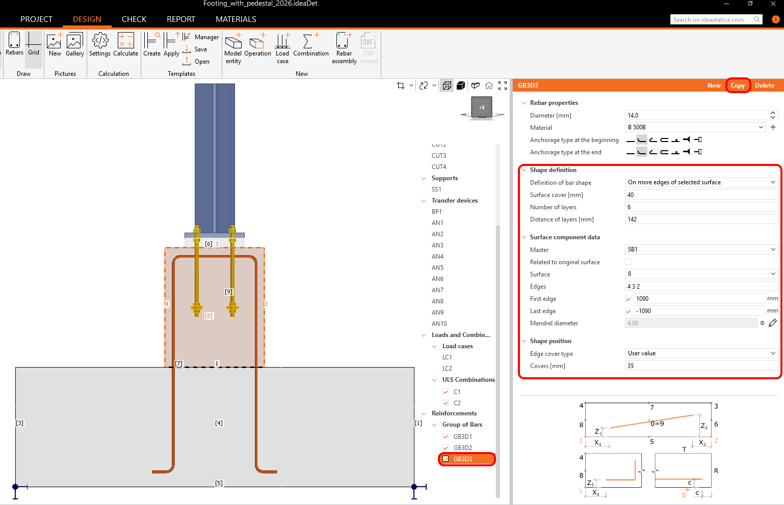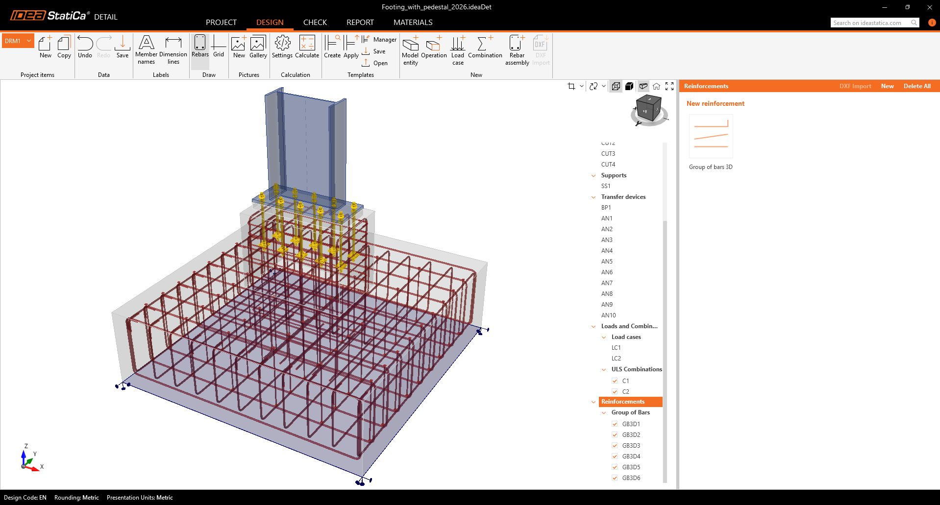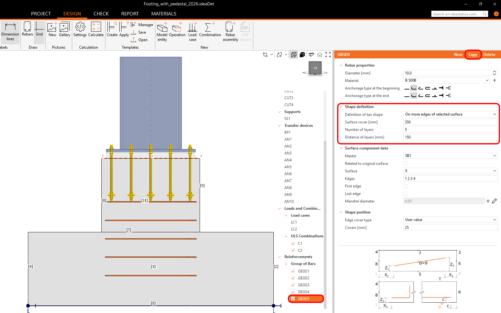 The following section outlines the steps for the reinforcement layout of the entire footing with a pedestal. Follow the steps (1). You can deactivate the rebars in the ribbon (2) to see only selected rebars. It will help you intuitively recognize each group.