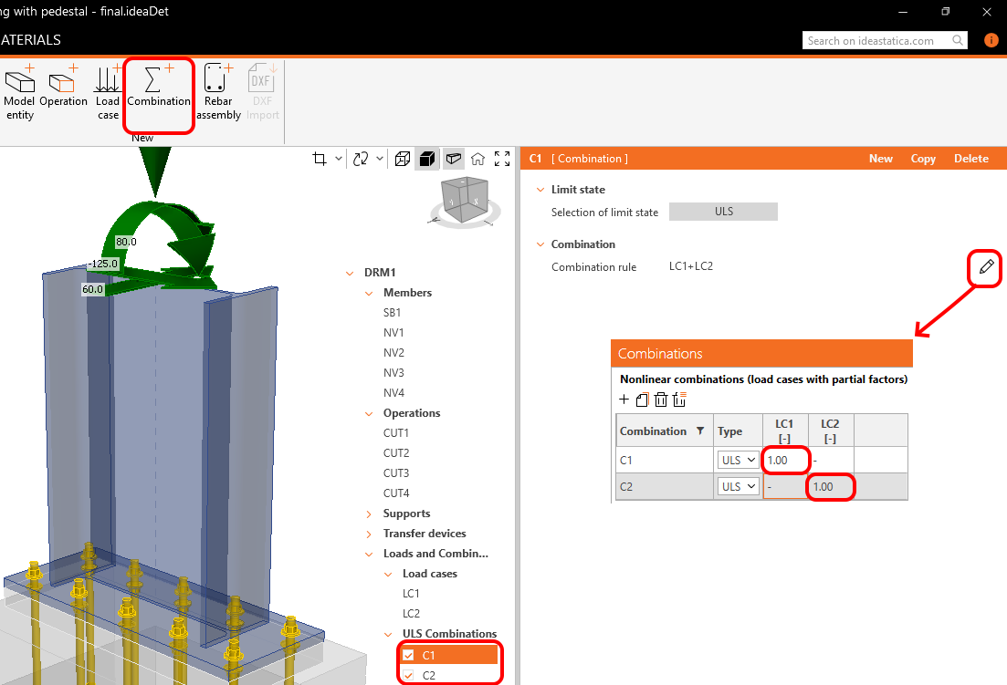 The software primarily works with combinations, rather than individual load cases. Combinations must be explicitly defined. This model uses ULS combinations LC1 and LC2 as load cases, integrated in the combination tab with a partial factor of one.