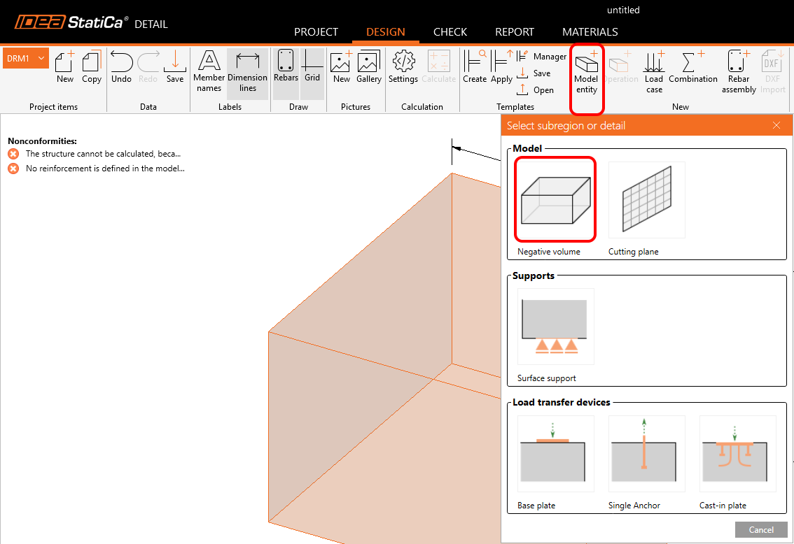 The standard cuboid pops up, with the definition of its dimensions being Width - X, Depth - Y, and Height - Z, which is related to the GCS (Global Coordinate System). The system of nonconformities in the 3D scene (left top corner) will notify you of what is missing to initiate a successful analysis.