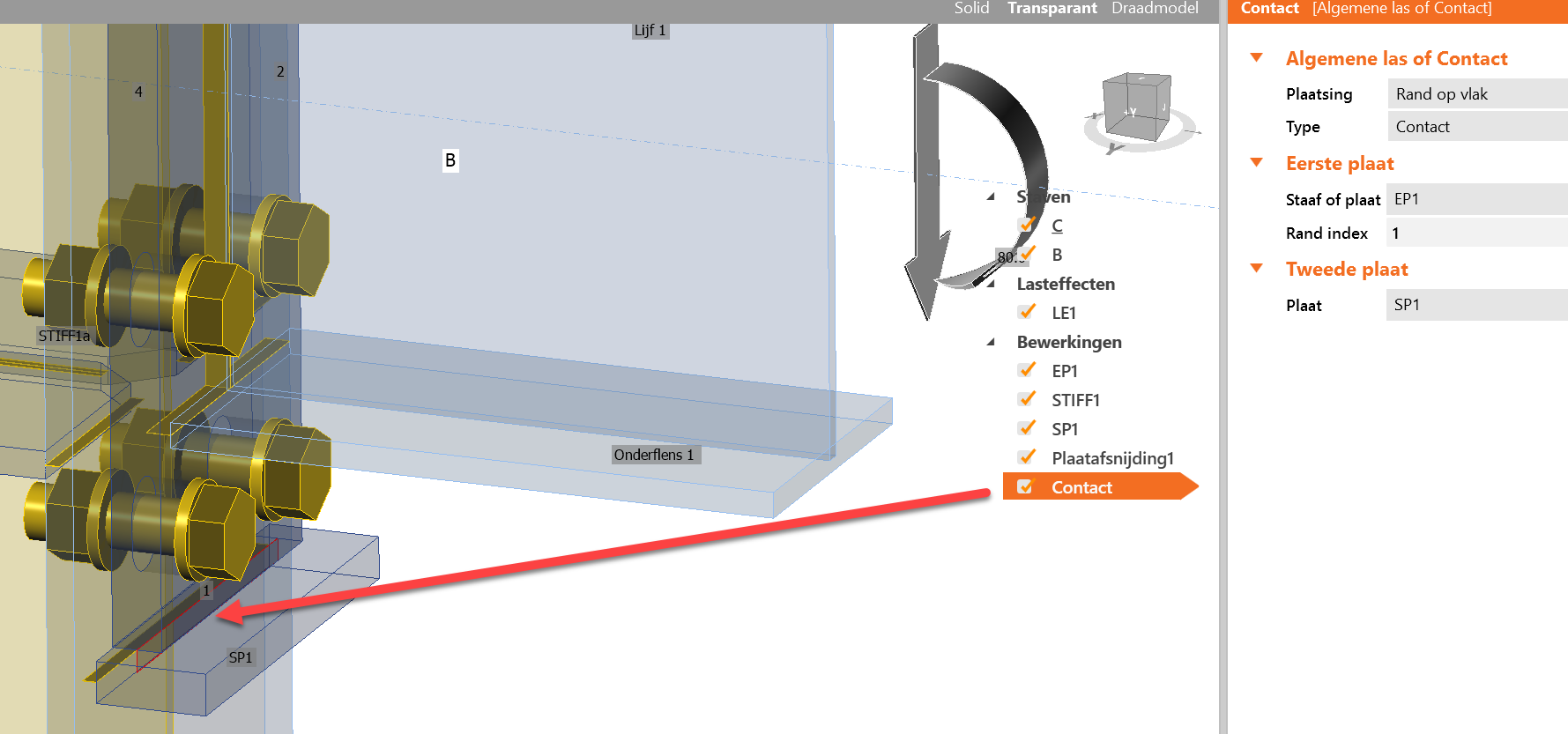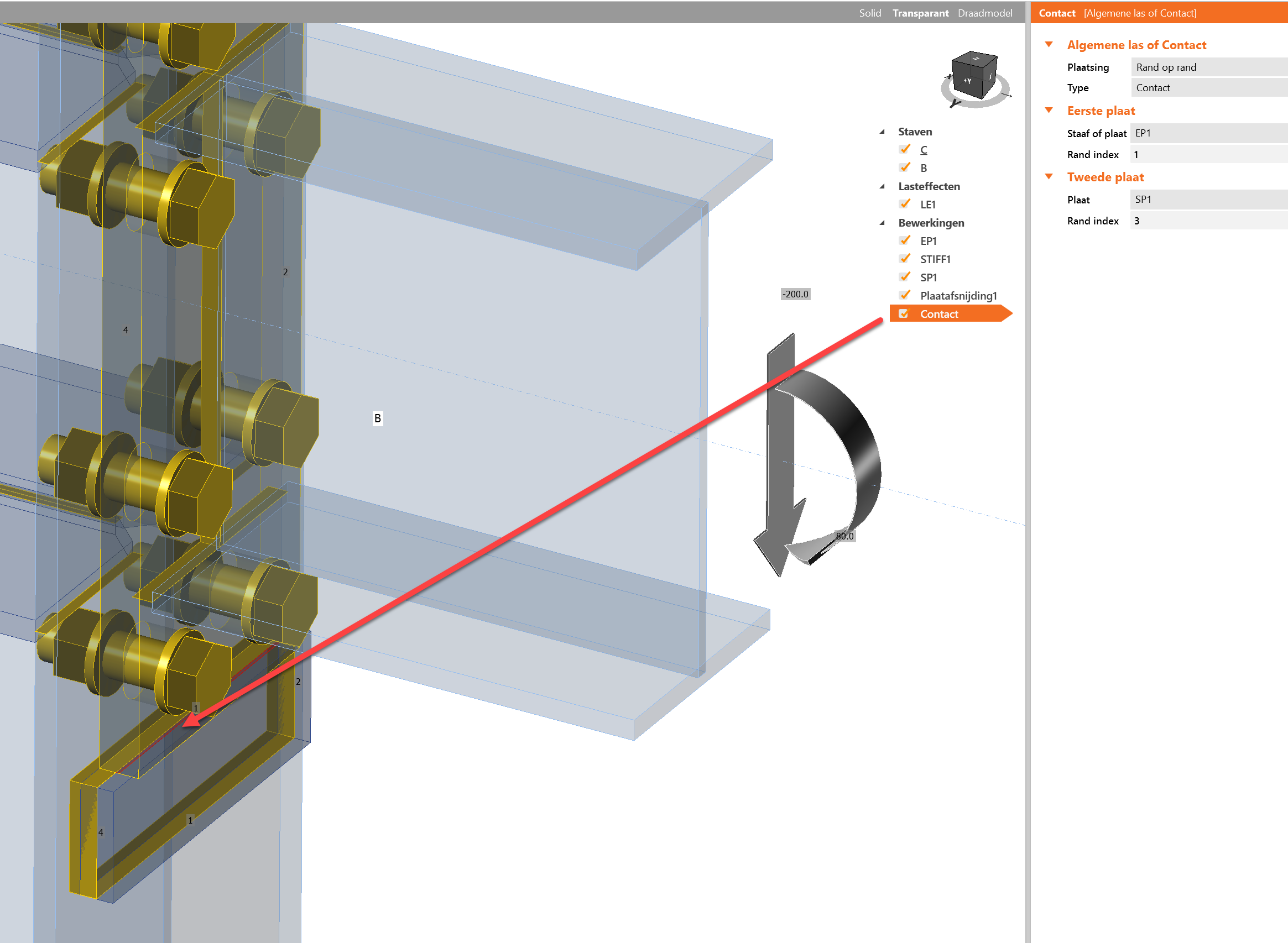 In bijgevoegd model is te zien dat er een contactrand RAND-op-VLAK (bij 2) is aangemaakt Op een gelijke manier zoals men een las zou aanmaken.