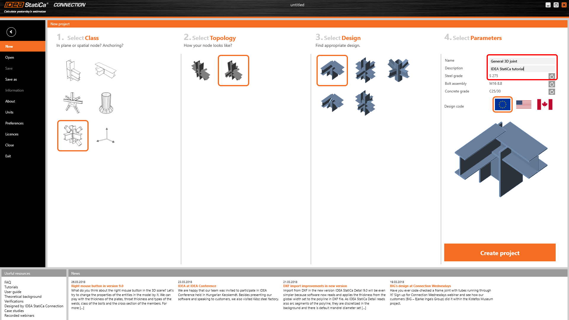 Start with launching the IDEA StatiCa Connection. Create a new project by selecting a starting template closest to the desired design, filling in the name, and choosing the design code and default material properties – S 275.