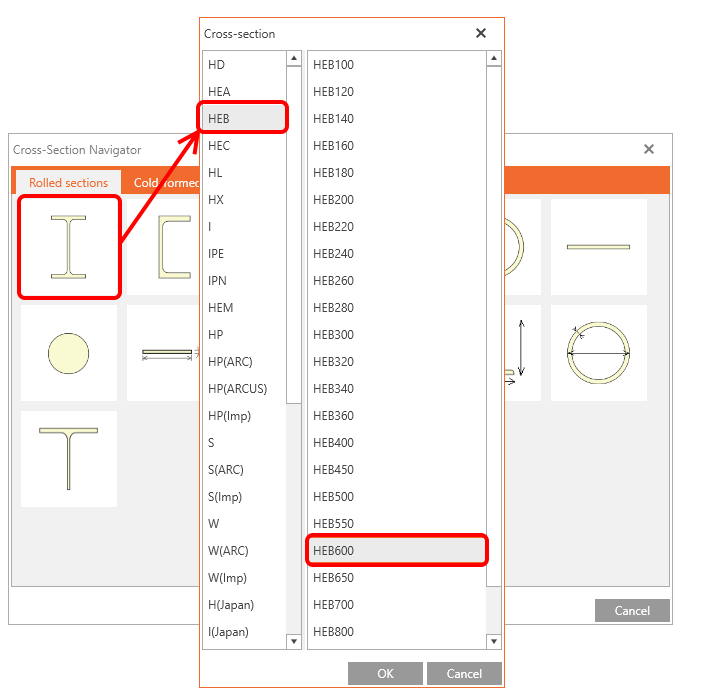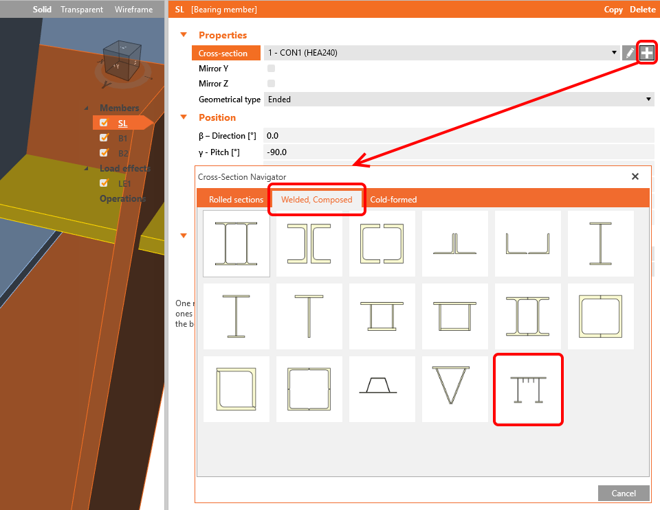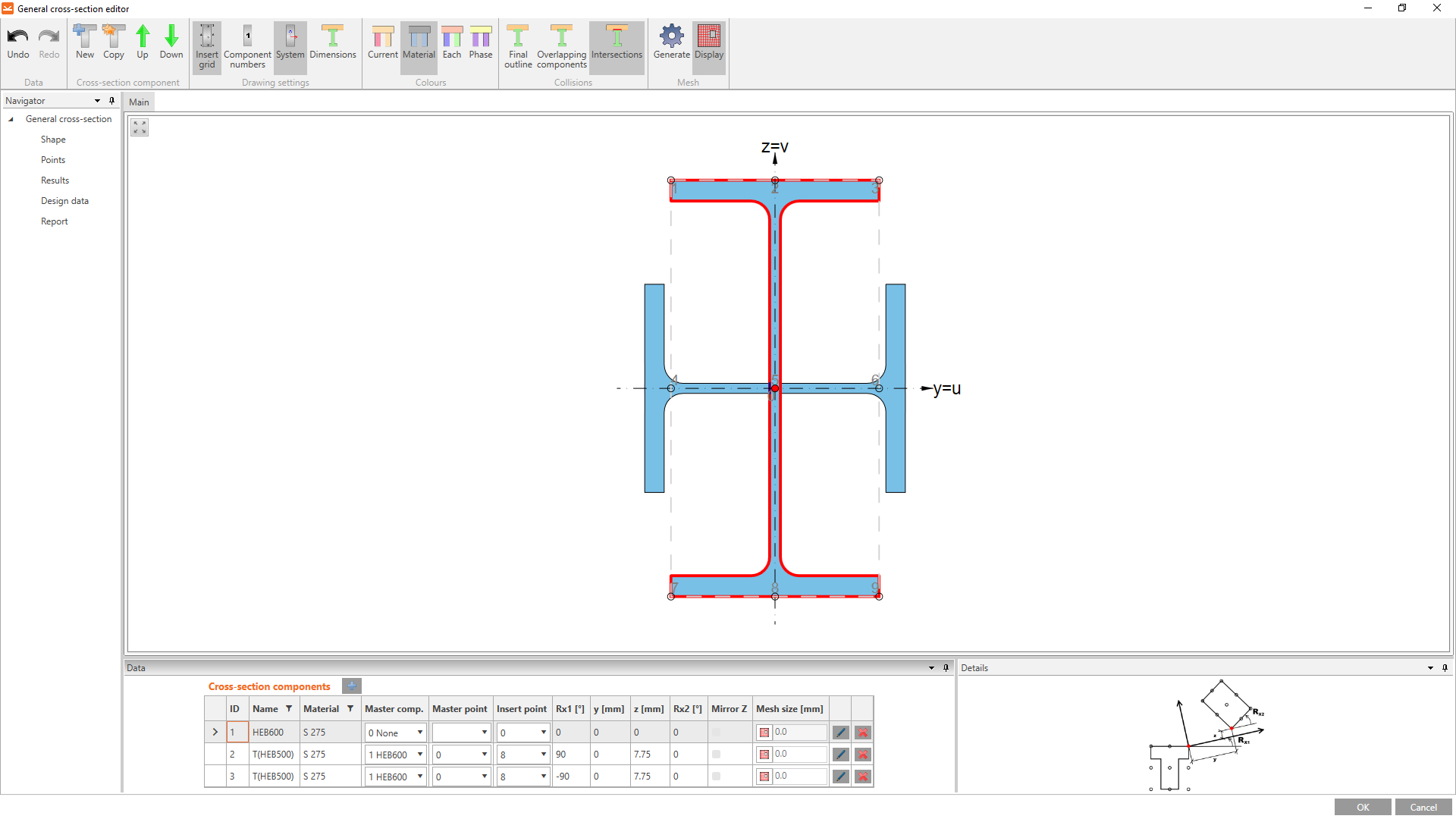 The General cross-section editor is opened, and you can start composing the cross-section by selecting the I sections in the Cross-section Navigator.