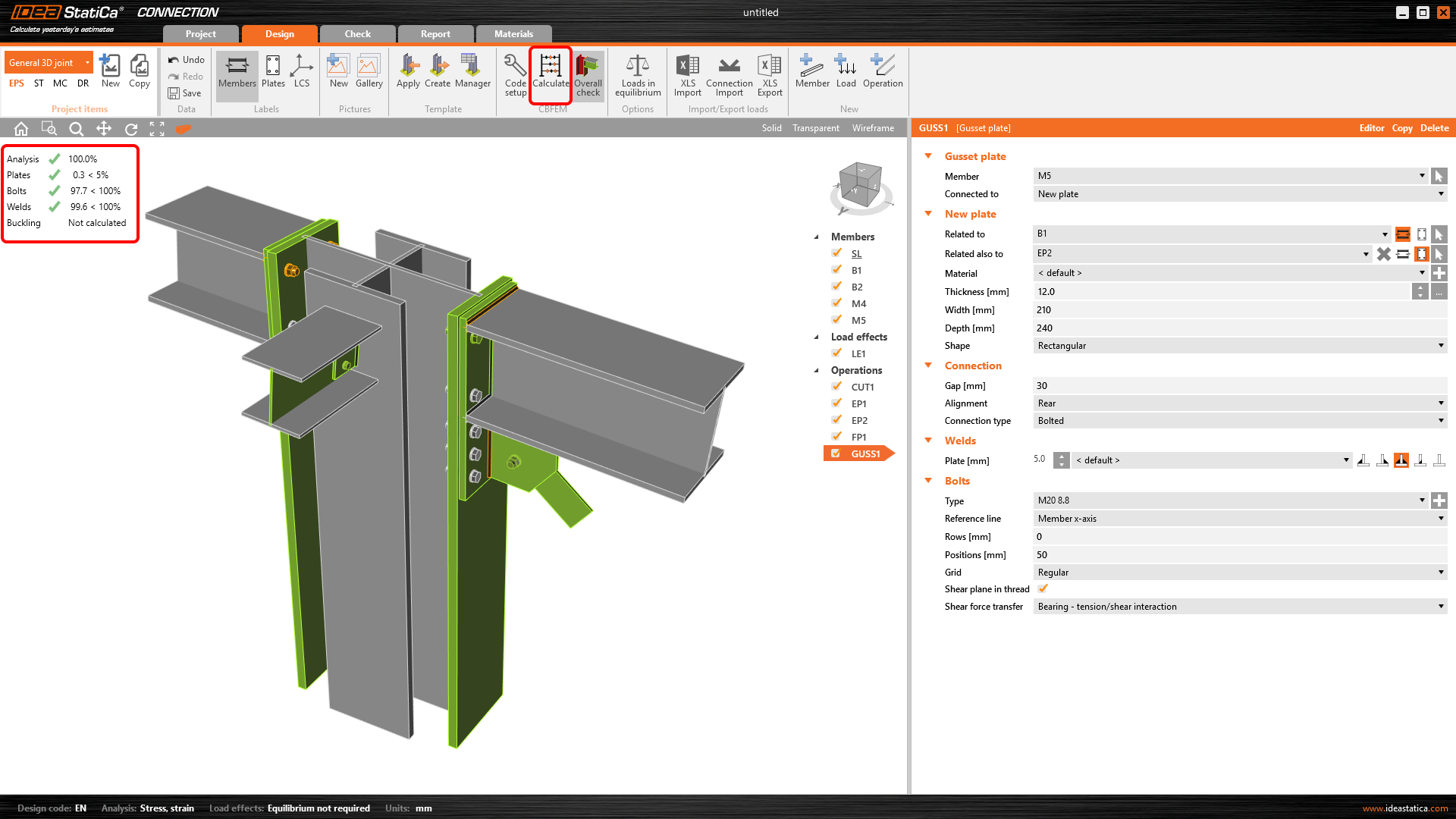 You can start the analysis based on CBFEM by clicking Calculate in the ribbon. The analysis model is automatically generated, the calculation is performed, and we can see the Overall check displayed together with basic values of check results.