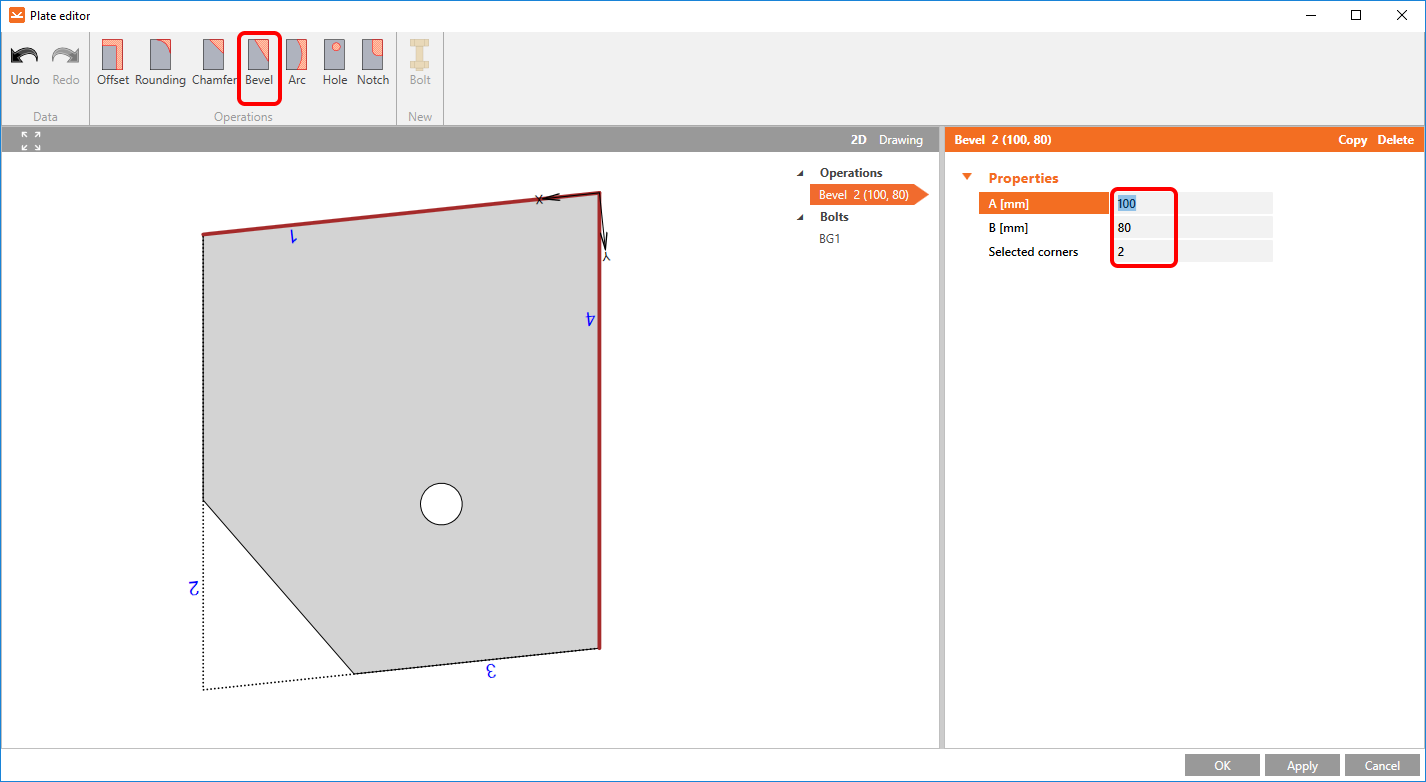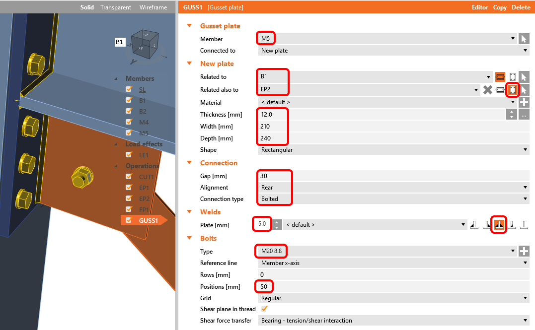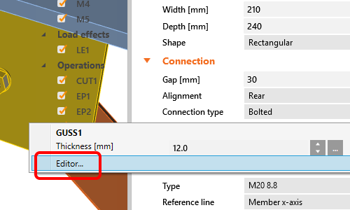 Finally, edit the gusset plate shape. With the right mouse button, click on plate GUSS1 in the 3D scene and choose Editor.