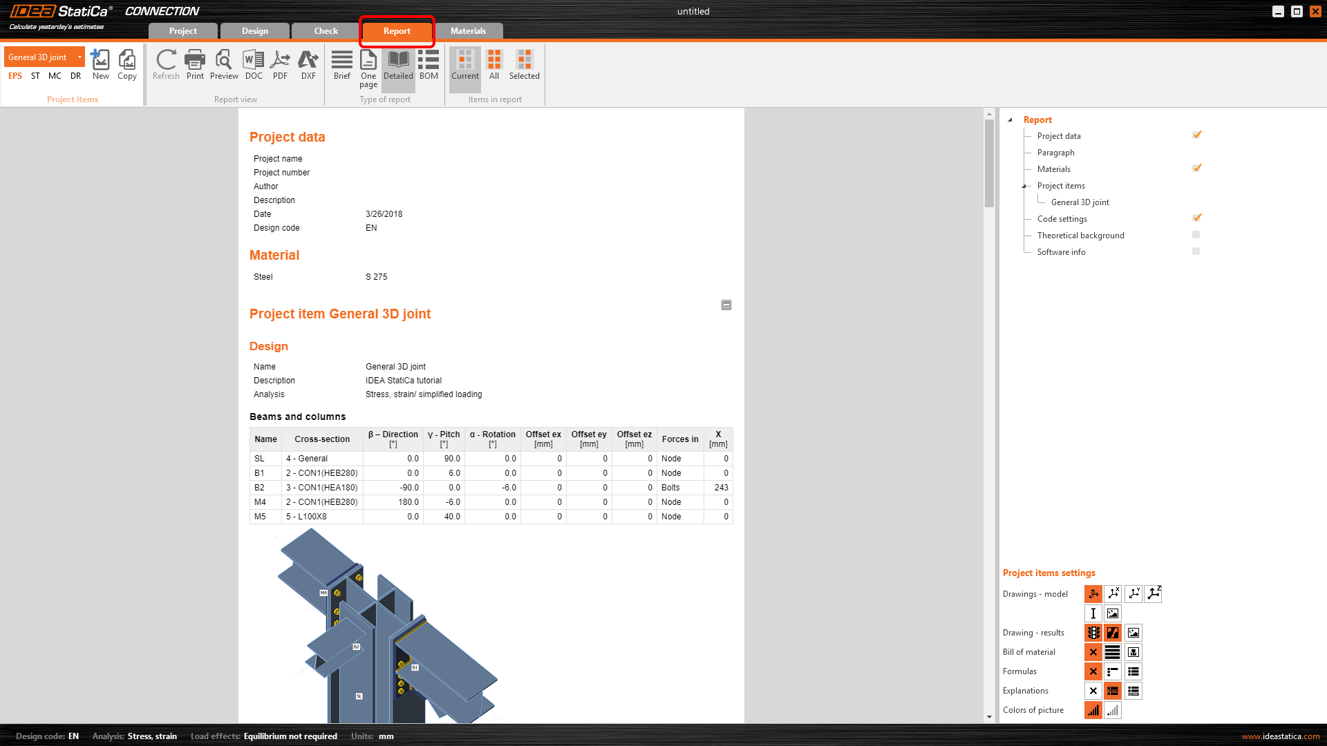At last, go to the tab Report. IDEA StatiCa offers a fully customizable report to print out or save in an editable format.