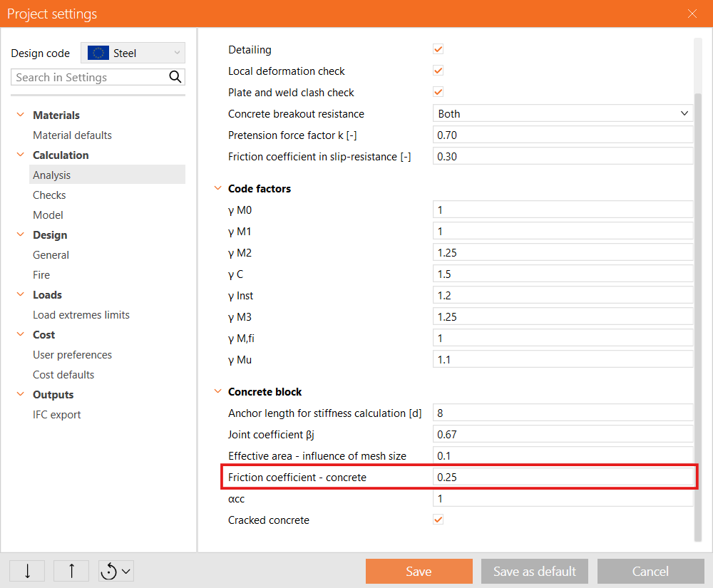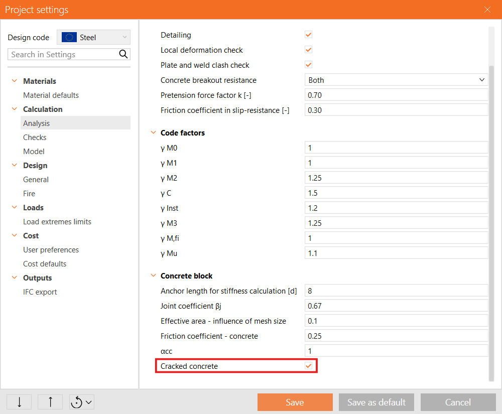 In the Code setup, you can switch the concrete setting to uncracked, which increases the capacity for anchor code checks. For EN standards, this affects the Concrete blowout resistance as parameter k5 and Concrete cone resistance as parameter k1. While for AISC standards, it influences the Concrete breakout strength and parameter Ψc,N. By default, the concrete is set to cracked but can be changed to uncracked in Project settings.