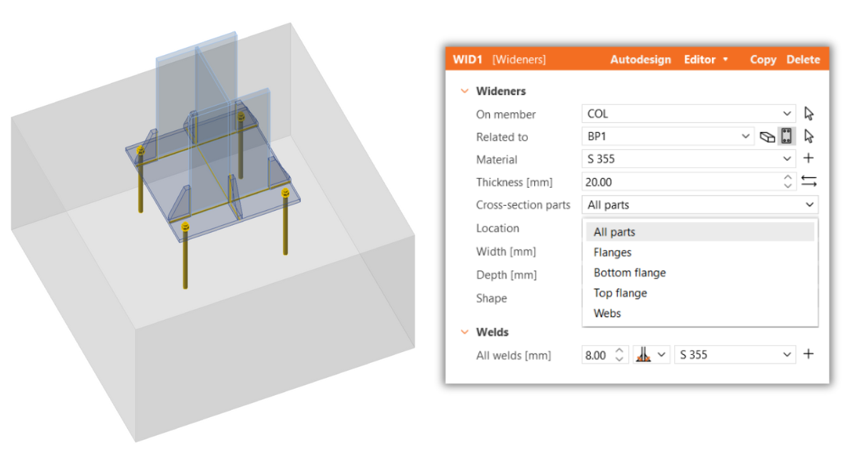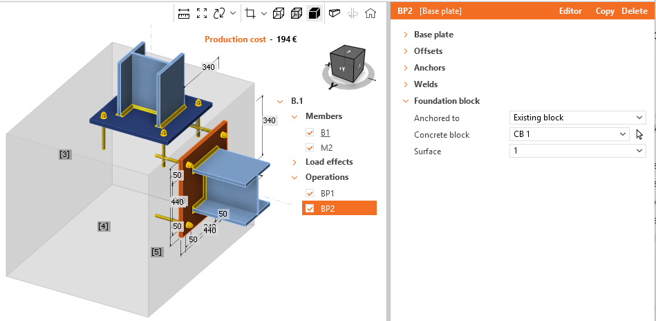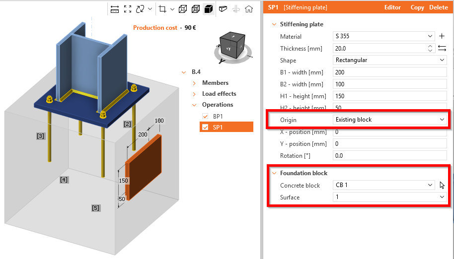 There is also a new option for the Stiffening plate – its Origin can now be defined on the Existing block of concrete. When selected, the stiffening plate is automatically placed on the selected concrete block and its surface. Location is in the middle of the surface.