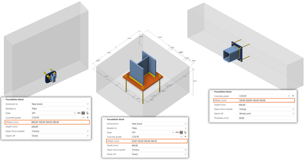 The concrete foundation is limited to a rectangular shape, but its dimensions can be adjusted using offset values for each edge. Entering a single value creates a uniform offset around the anchored cross-section outline. Inputting two values applies symmetrical offsets in two directions. Providing four values applies offsets to each edge individually to easily achieve asymmetrical anchoring