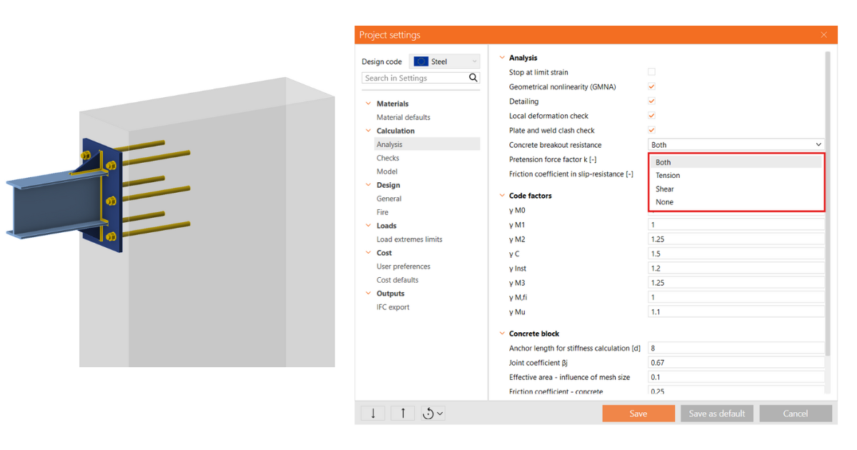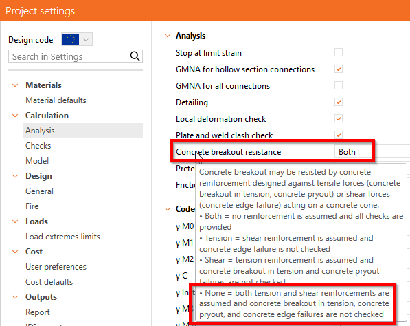 In IDEA StatiCa Connection, you can disable the concrete breakout resistance check in the Code setup and choose from the following options: