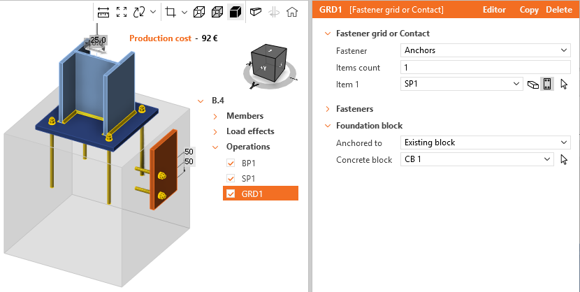 For the Fastener grid or Contact operation, a new logic has been implemented. When the referenced plate is located on the face of the concrete block, and the operation is set to Anchors, the surface is automatically recognized and used for the creation of the subsoil model.