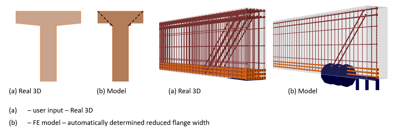 If the Real 3D is activated, the user input displays (without modification). If the Model view is activated, the automatically determined view with reduced flange width displays. Notice also the difference between the Real 3D and Model views of the reinforcement.