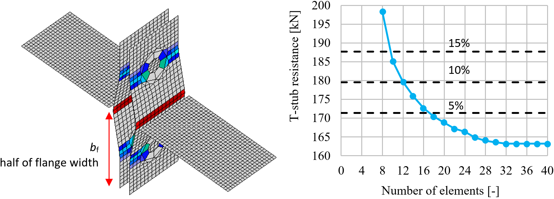The mesh sensitivity study of a T-stub in tension is presented. Half of the flange width is subdivided into 8 to 40 elements, and the minimal element size is set to 1 mm. The influence of the number of elements on the T-stub resistance is shown in the following figure. The dashed lines are representing the 5%, 10%, and 15% difference. It is recommended to use 16 elements on the half of the flange width.