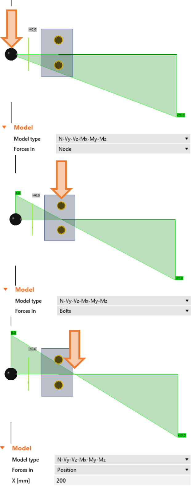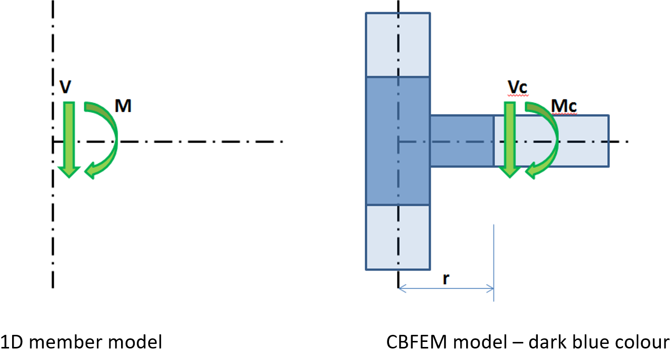 For better precision of the CBFEM model, the end forces on 1D members are applied as loads on the segment ends. Sextuplets of forces from the theoretical joint are transferred to the end of the segment – the values of forces are kept, but the moments are modified by the actions of forces on corresponding arms.