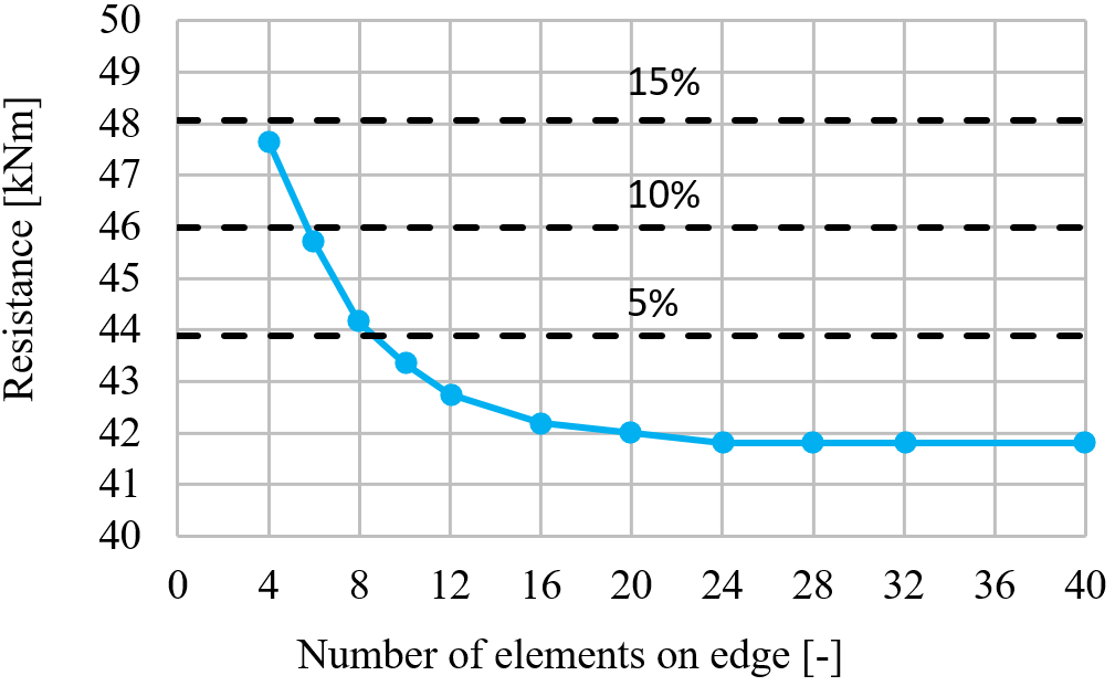 The following example of a beam to column joint shows the influence of mesh size on the moment resistance. An open section beam IPE 220 is connected to an open section column HEA 200 and loaded by a bending moment as shown in the following figure. The critical component is the column panel in shear. The number of the finite elements along the cross-section height varies from 4 to 40 and the results are compared. Dashed lines are representing the 5%, 10%, and 15% difference. It is recommended to subdivide the cross-section height into 8 elements.