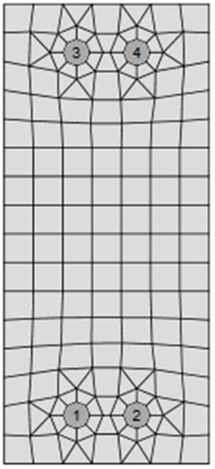 Shell elements are recommended for modeling of plates in the FEA of structural connection. 4-node quadrangle shell elements with nodes at its corners are applied. Six degrees of freedom are considered in each node: 3 translations (ux, uy, uz) and 3 rotations (φx, φy, φz). Deformations of the element are divided into the membrane and the flexural components.