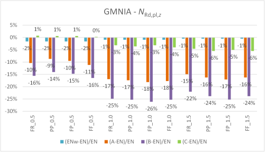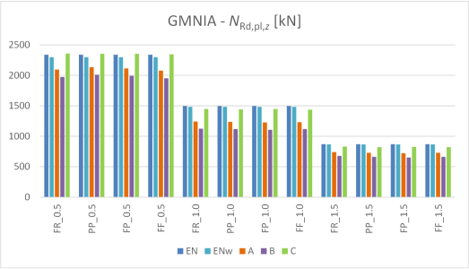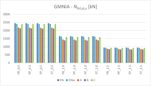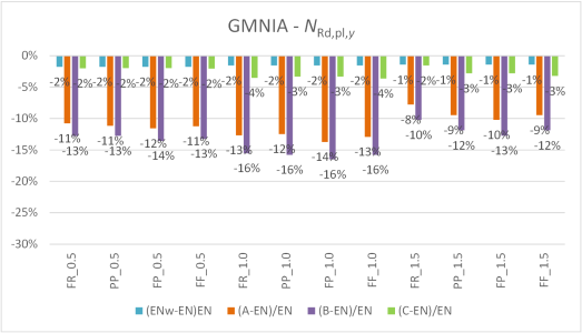 The results of GMNIA are conservative compared to the Eurocode solution. This is in part caused by the cross-section modeling in IDEA Member, this influence is under 2 % as can be seen from the blue column values in the chart above.