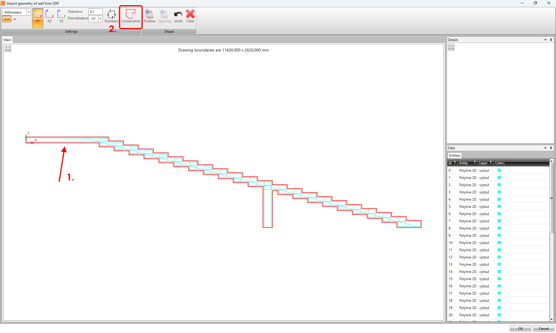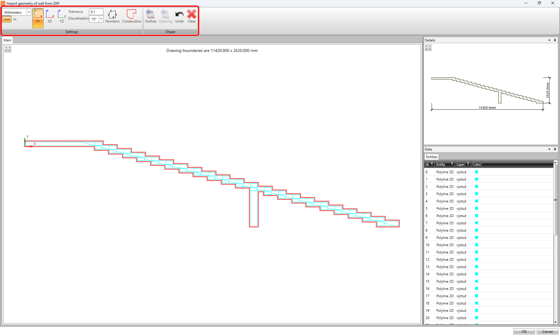 Simply click on the Import DXF button, pick the file from your storage, and start selecting the structure's outline. It can be done by choosing the lines individually in the main graphic window, or just a single line and then clicking the Consecutive button from the top ribbon.