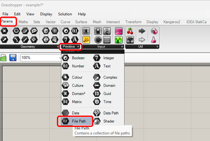 Create a new document, select the tab Params in the upper ribbon, and place the component File Path on the Canvas.