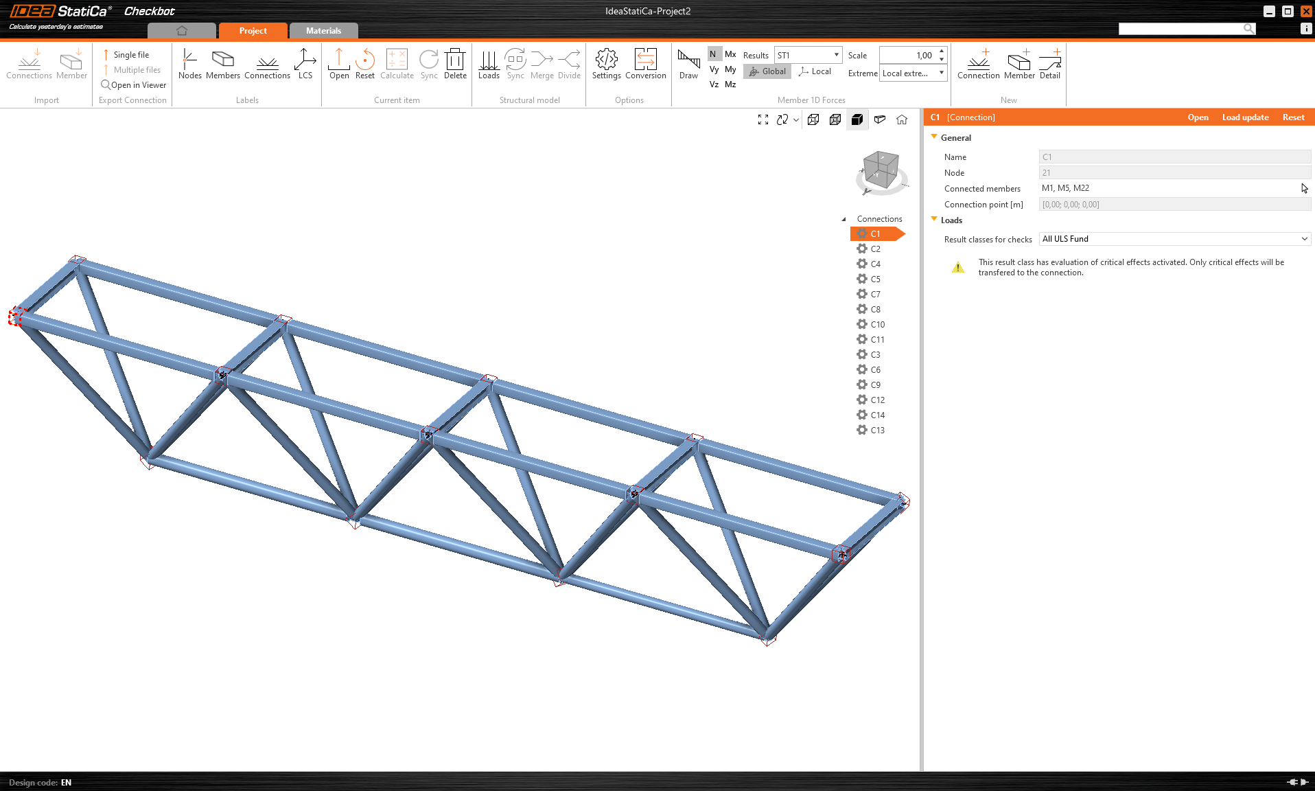 Please select one of the middle joints in the upper belt (e.g., C11) and open it in the IDEA StatiCa Connection.