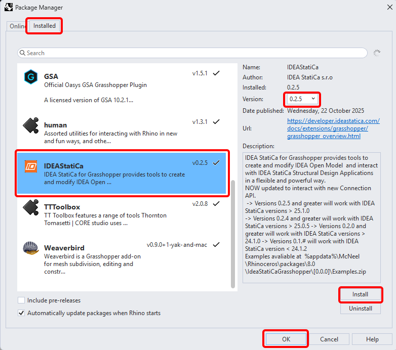 A new window appears; select IDEAStatiCa and click Install. The plugin will be downloaded and installed. To become active, a restart of Rhinoceros is necessary.