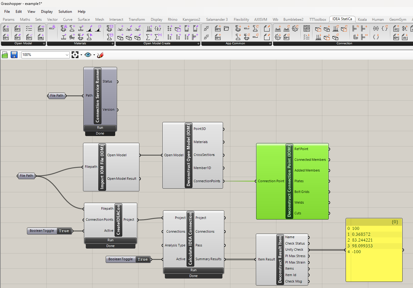 To run the calculation and get visible results, double-click on False/True. If you added the components Deconstruct Open Model and Deconstruct Connection Point, you can also see the contours and plates of the joint in Rhinoceros.