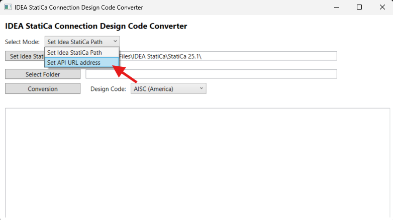 - Open the Connection Design Code Converter tool, select Set API URL address, and check/input the URL address from the previous step