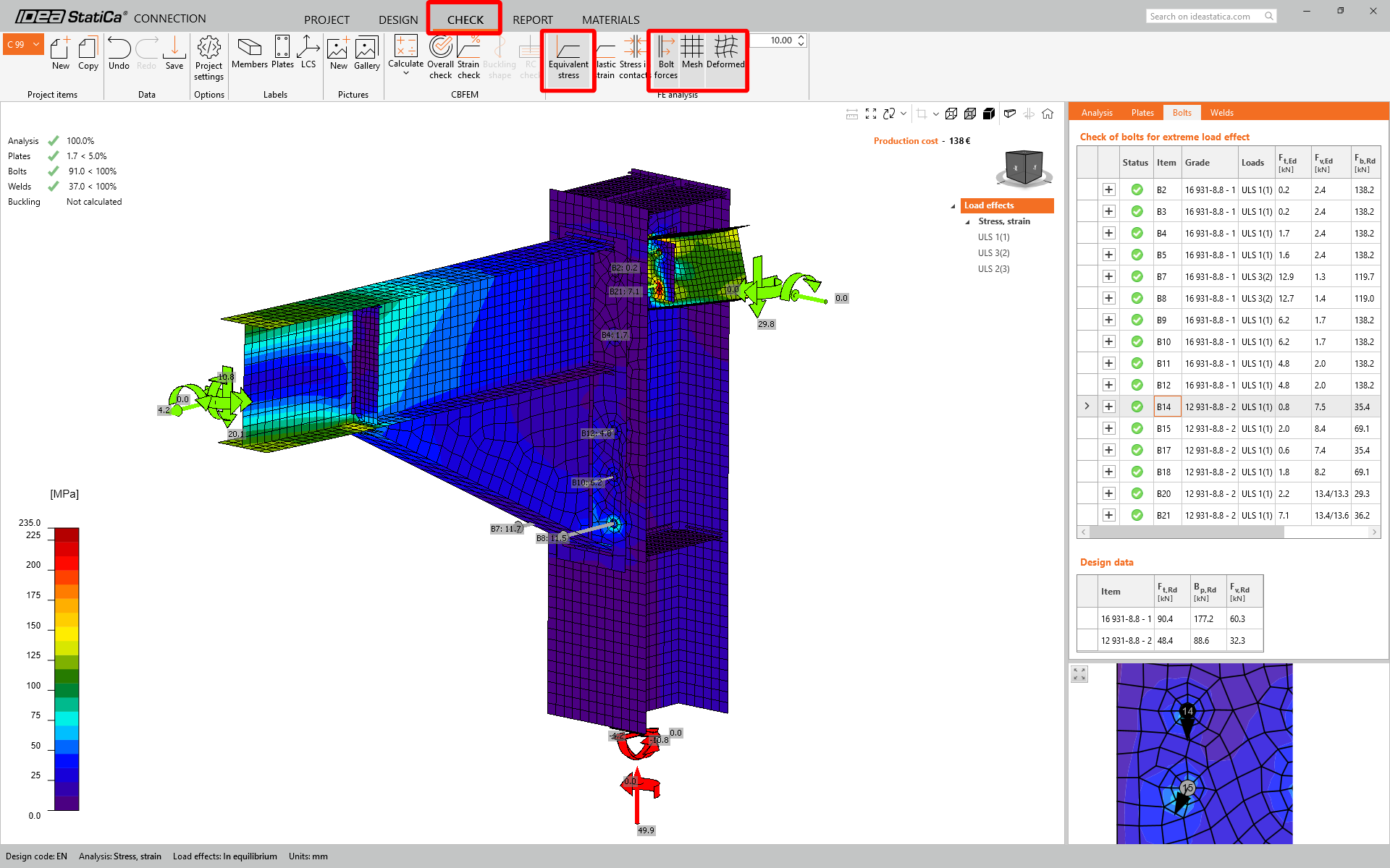 Go to the display tab Check and there activate Equivalent stress and Mesh model view from the ribbon to get a full picture of what is happening in the joint. To explore the detailed results for Bolts, expand bolt B3 details by clicking the plus icon.