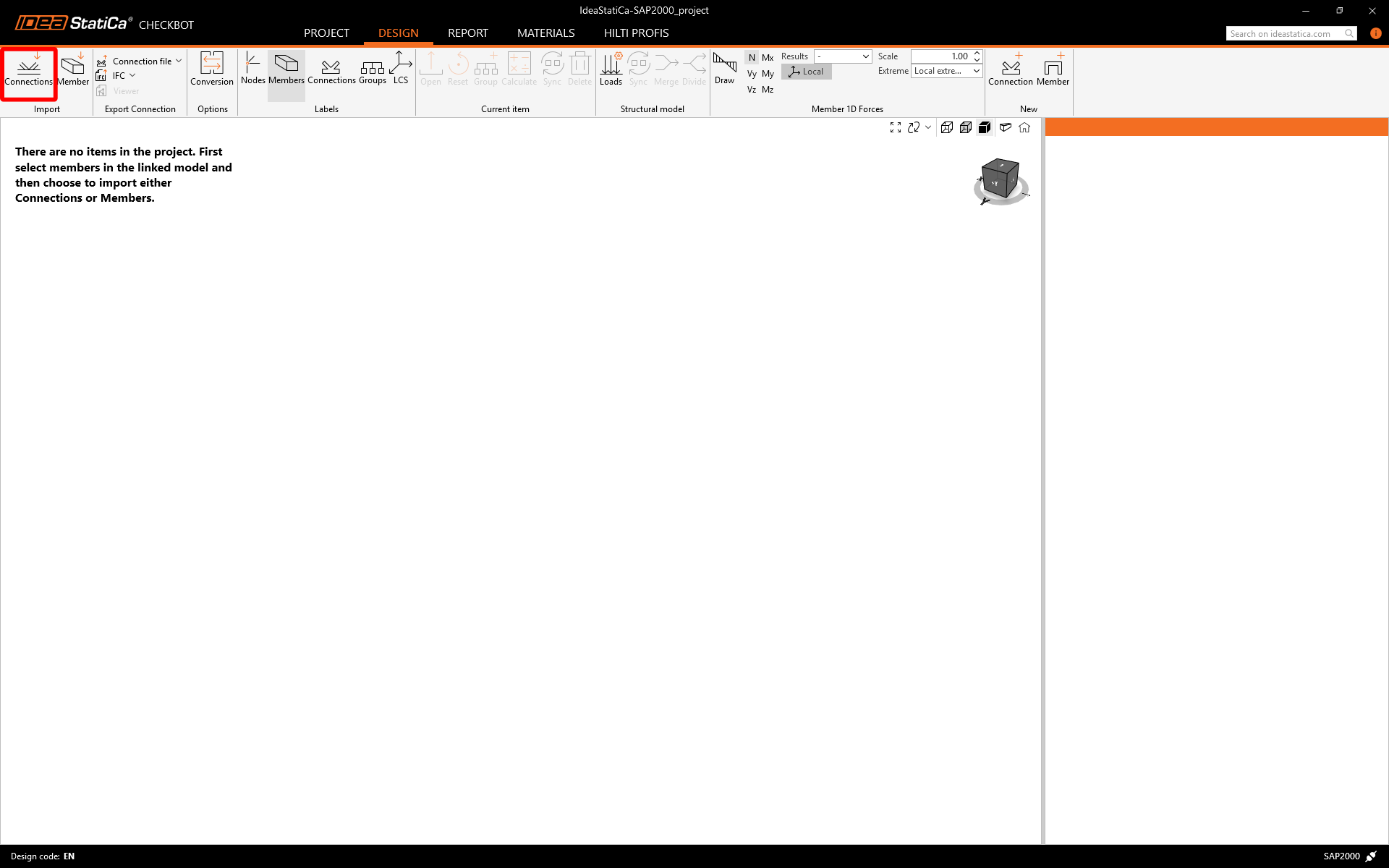 Select the Connection import command and find a path to the previously exported SAP2000 connection model (it is saved on the disk next to your SAP2000 project file in the subfolder Connections).