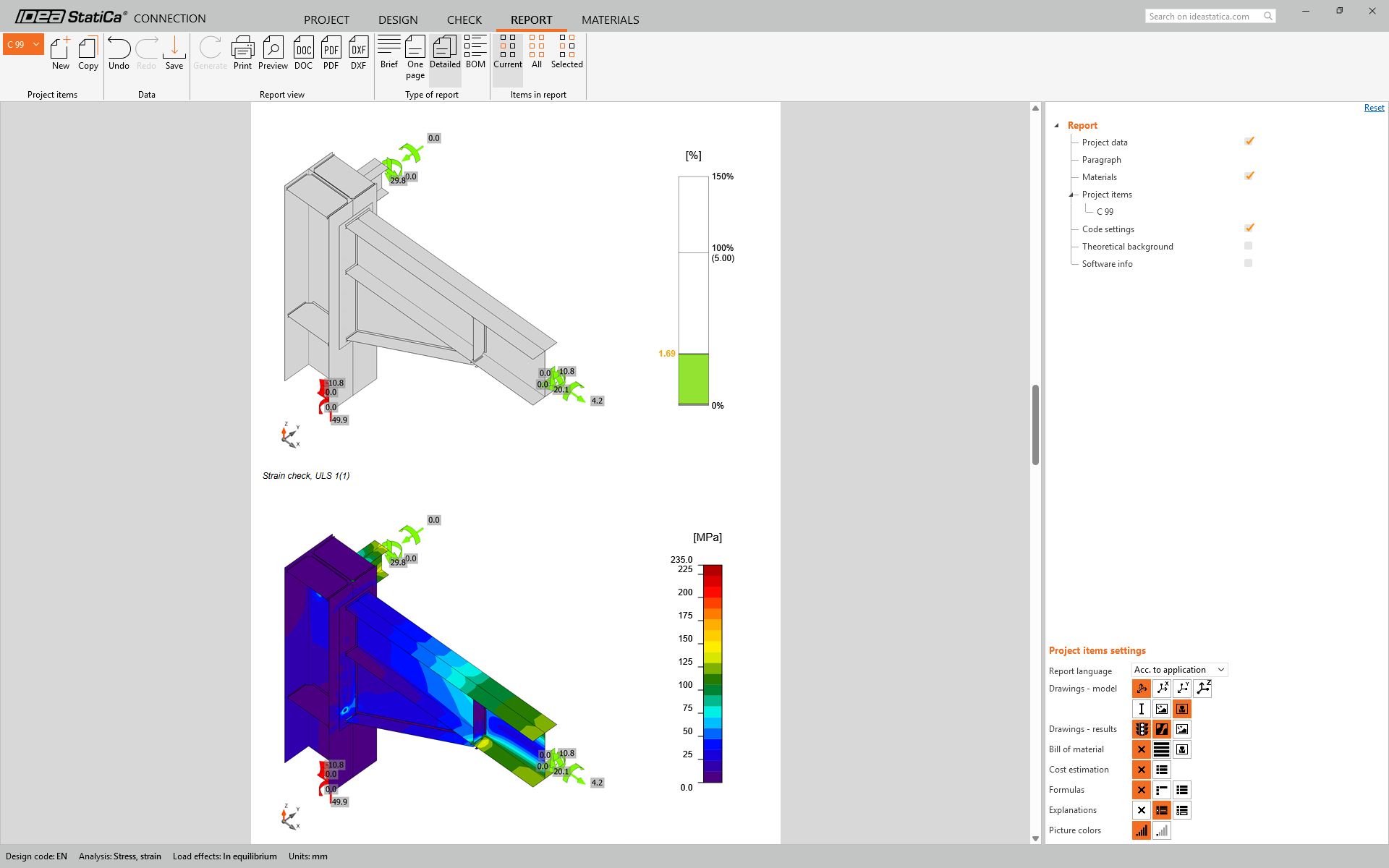 Next, go to the tab Report. IDEA StatiCa offers a fully customizable report to print out or save in an editable format.