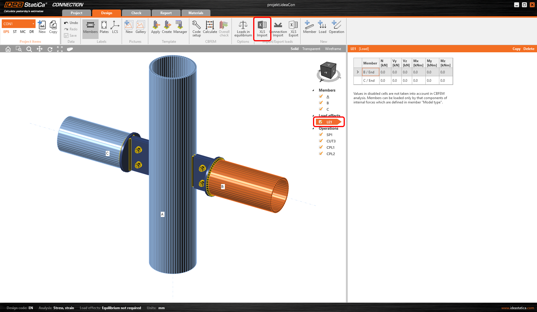 It is possible to import the load effects from an Excel sheet provided the table is correctly organized. The order of members, as well as of the internal forces and their units, must comply with the IDEA StatiCa Connection project.