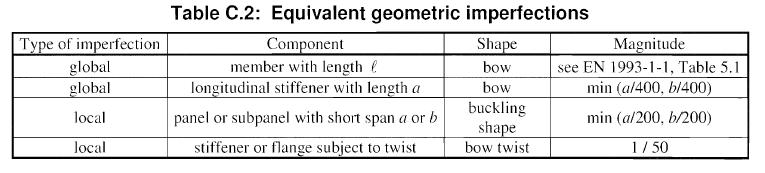 Positive + and negative - values of imperfections e0 should be applied consecutively, and the more dangerous results should be considered relevant. If imperfections are applied to more buckling shapes, all possible combinations of + and - imperfection values should be calculated.