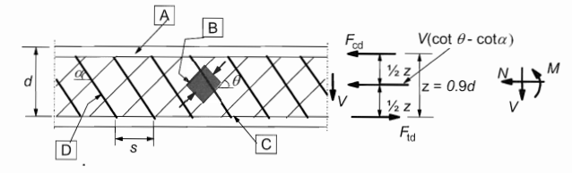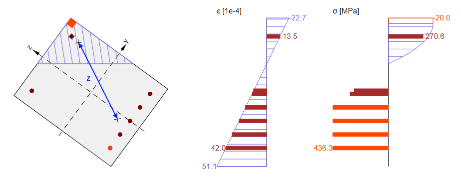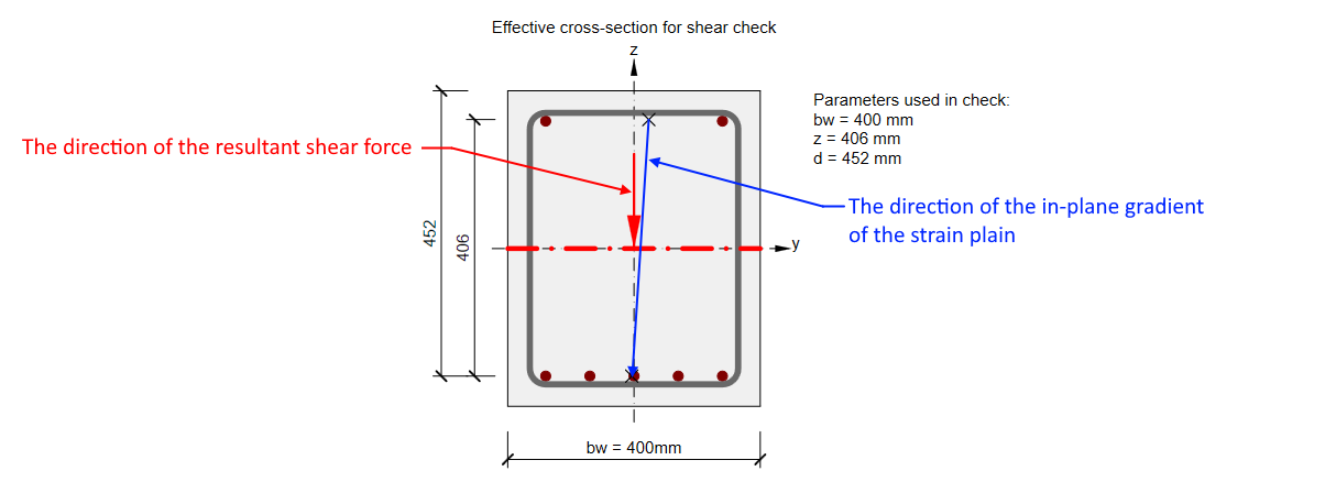 This is the most common case where the direction of the biaxial bending moment (in-plane gradient of the strain plain) and the resultant shear force are the same or almost the same. The values of z and d are calculated automatically as shown in the figure.