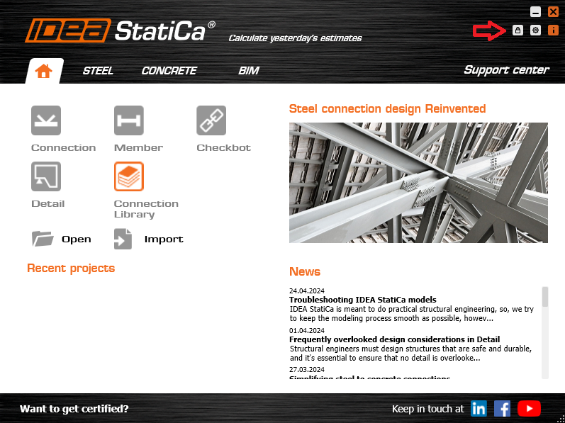 Open IDEA StatiCa and go to the license setup (click on the “Lock” icon).