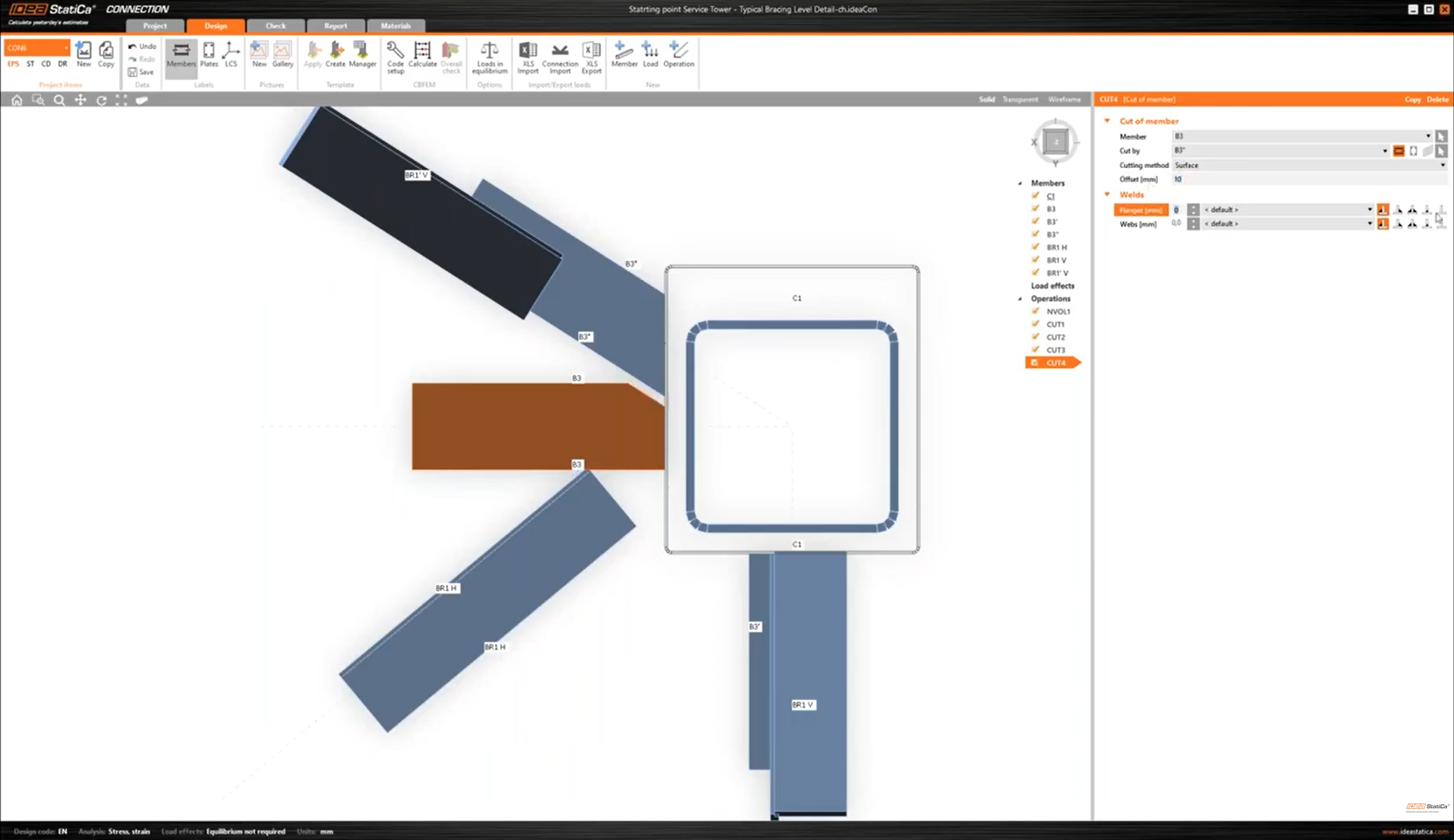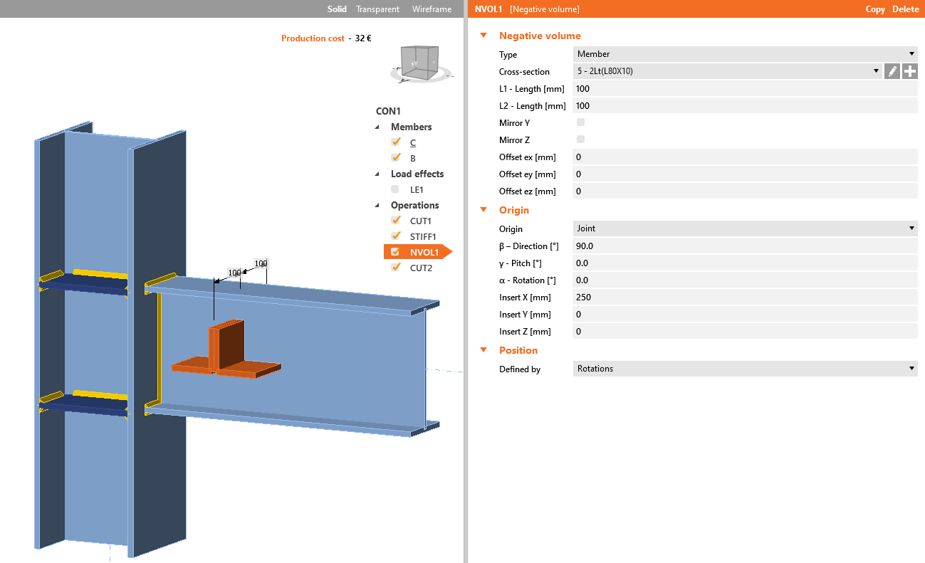 This is visualized in the 3D window as a solid member and can be used to cut out any part of members, stiffening members, and plates that intersect with the negative volume solid.