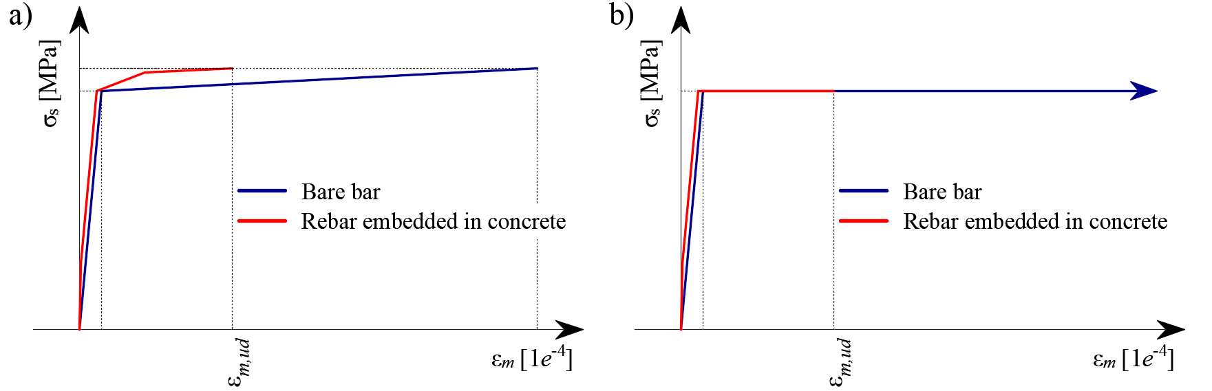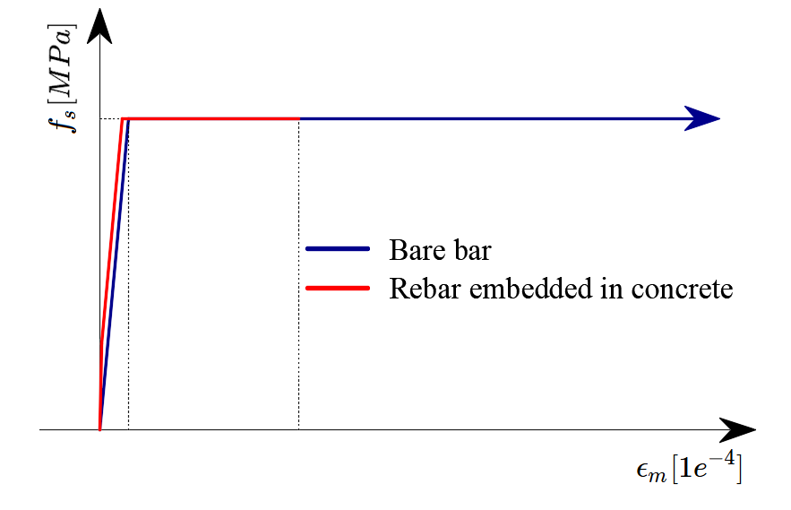 Tension stiffening is considered by modifying the stress-strain relationship of the bare reinforcing bar to capture the average stiffness of the bars embedded in the concrete (εm) (Fig 1b).