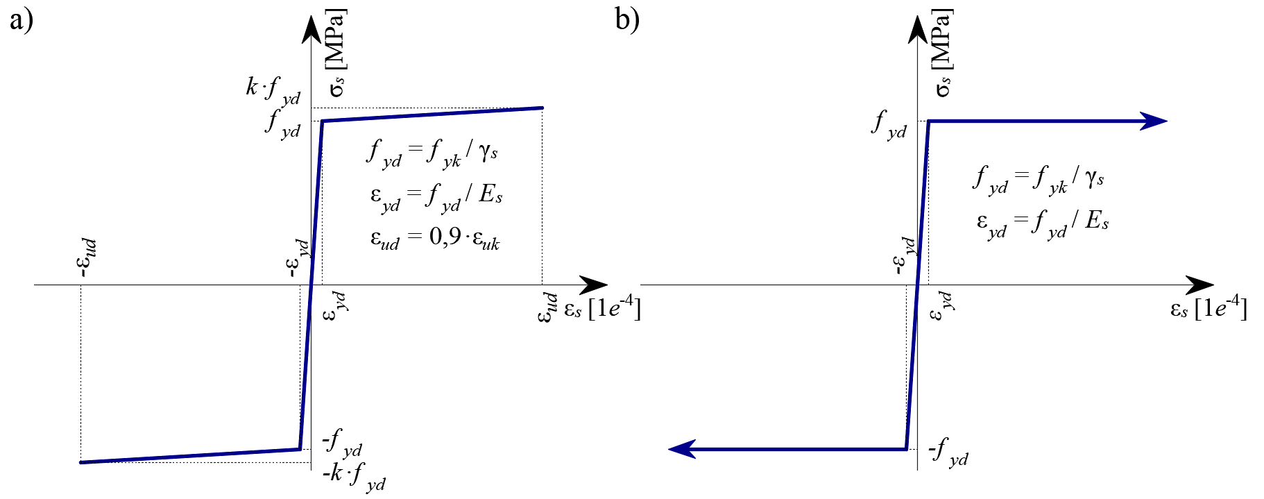 A perfectly elasto-plastic stress-strain diagram with a defined yield point for the non-prestresses reinforcement is considered, see AS 3600 Section 3.2. The definition of this diagram only requires the basic properties of the reinforcement to be known – the strength and modulus of elasticity.