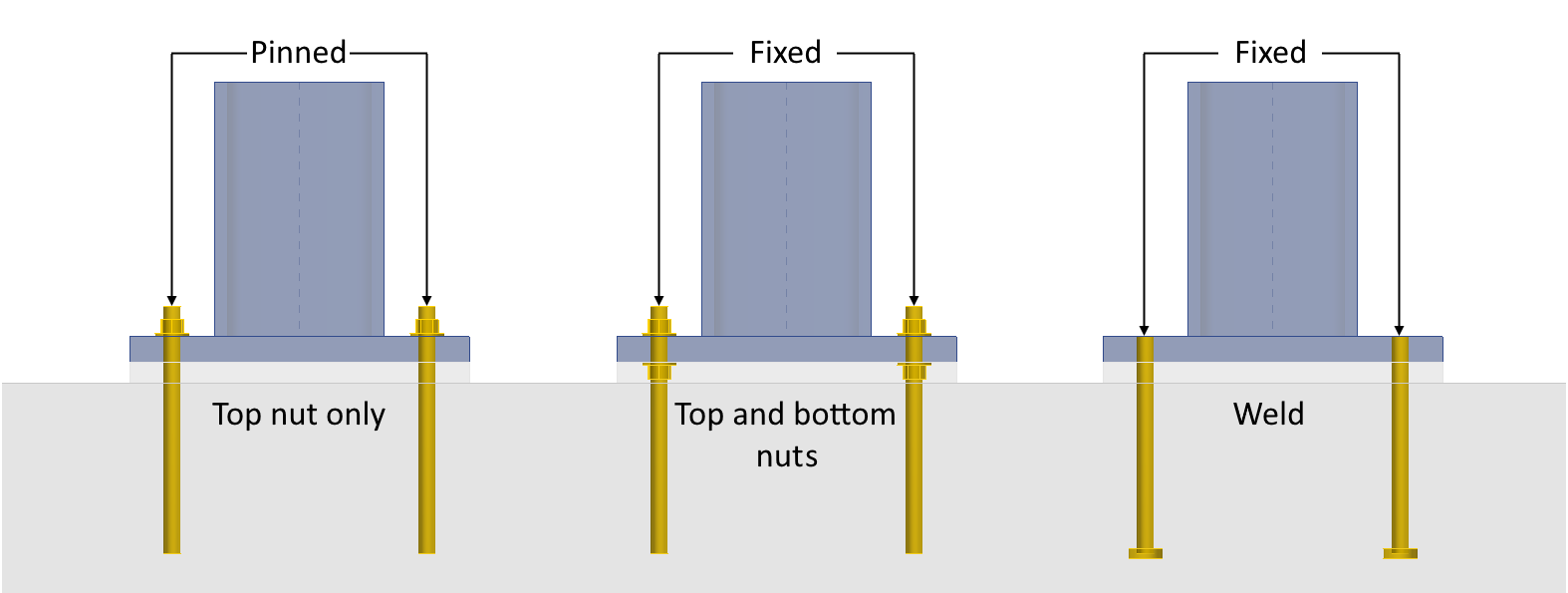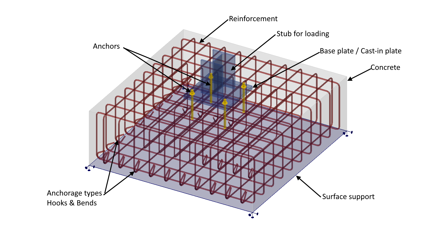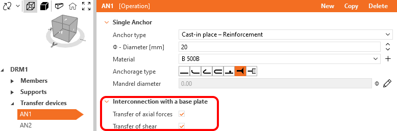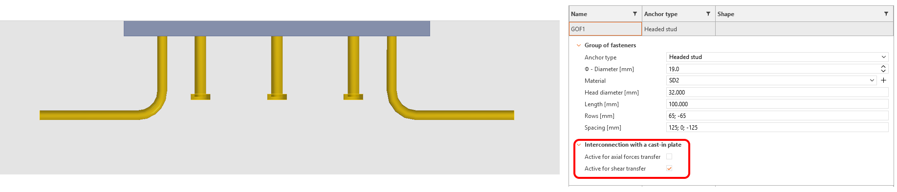 More information about connecting individual anchor types to the base plate or cast-in plate can be found in the chapter Finite elements types - Load transferring devices.