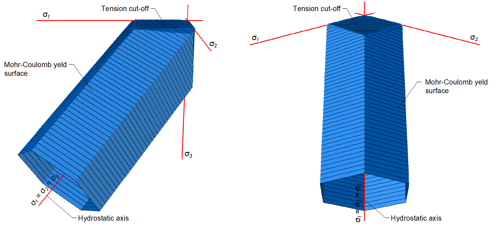 \[ \textsf{\textit{\footnotesize{Fig. 2\qquad Mohr-Coulomb multi-surface plasticity model for friction angle 0 degree}}}\]