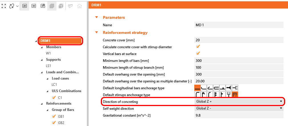 Only uncoated or zinc-coated (galvanized) reinforcement is supported, so ψe = 1.0. ψg is automatically determined from the reinforcement grade, and ψt is automatically derived from the position of the reinforcement in the model and from the direction of concreting that can be set in the application for each project item as follows.