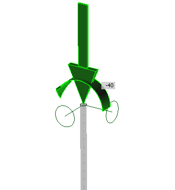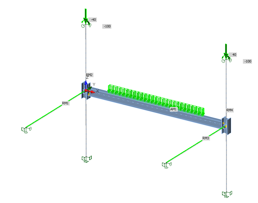 Columns are the related members at the model. They are fixed at the bottom. At the top, they are supported only in transverse direction (y, z). That allows loading the columns by the weight of the rest of the structure – by normal force and bending moment in this example. Their magnitudes correspond to the internal forces solved on 3D model in FEA software. There is no other load acting on the columns.