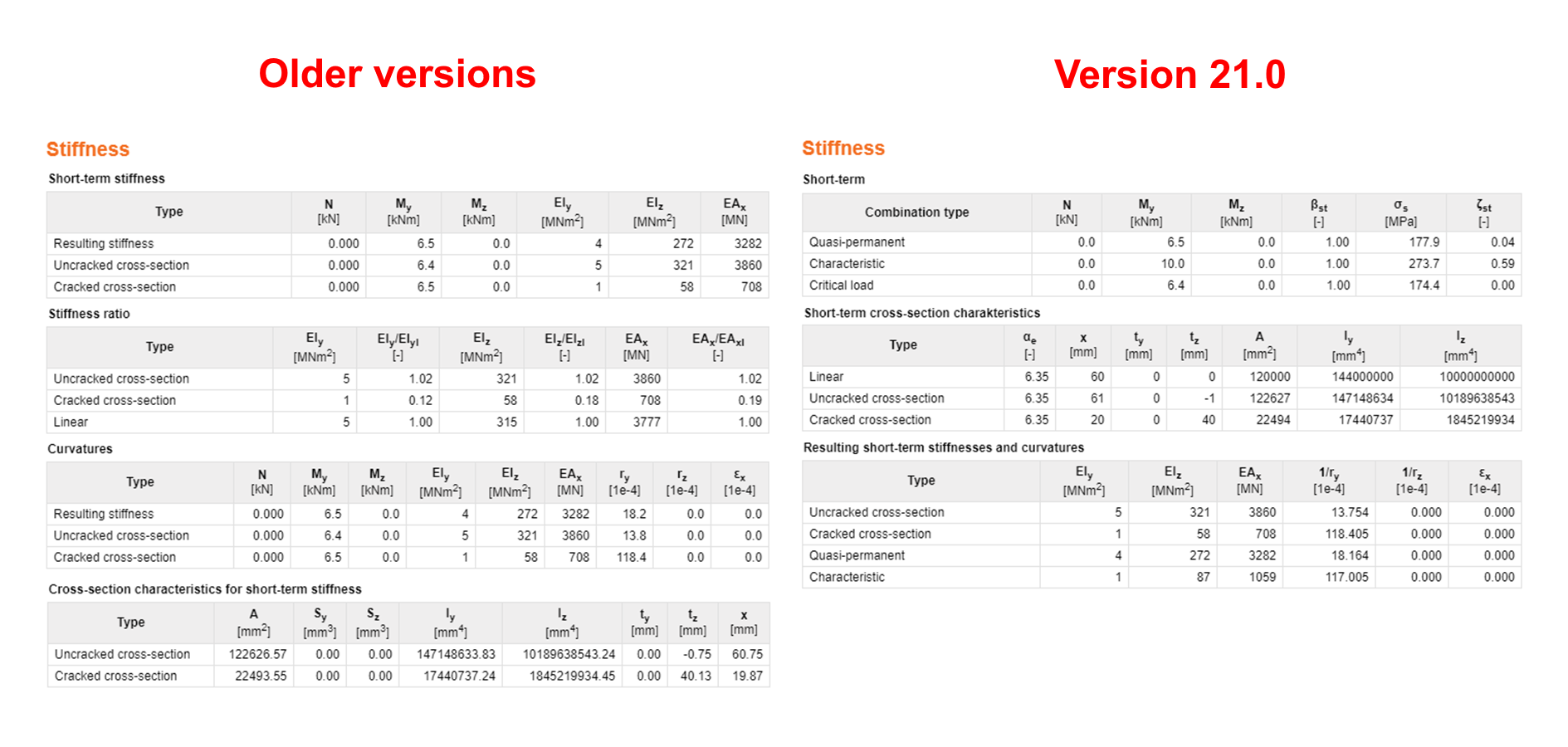 As you know, in the previous versions, some values for stiffness calculation were displayed repeatedly, while others were missing. It was hard to understand it, kind of black box. Now, the users can find straightforward and comprehensive tables listing all necessary stiffness values and inter-result in the Stiffness tab of the RCS app. You can easily find out the stiffness corresponding to a characteristic or quasi-permanent combination, the bending moment at the first occurrence of cracking, etc.