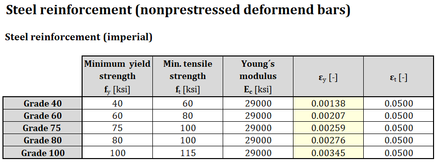 ACI 318-19 defines materials of normal-weight concrete and reinforcement (non-prestressed deformed bars), and they are now implemented in the Detail app. The materials are defined in imperial units as well as in metric units. All material properties (for concrete and steel reinforcement) defined by ACI 318-19 (and relative ASTM docs) are specified below.