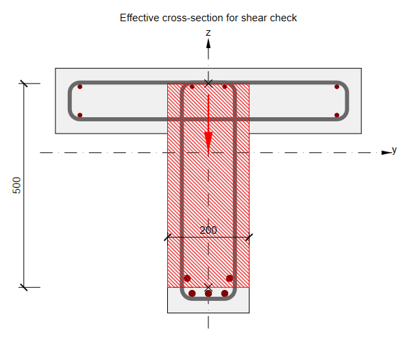 Calculated longitudinal force due to shear is applied to the cross-section with all components (concrete and rebars). The initial stress state taken from the N+My+Mz response is already defined for each component.