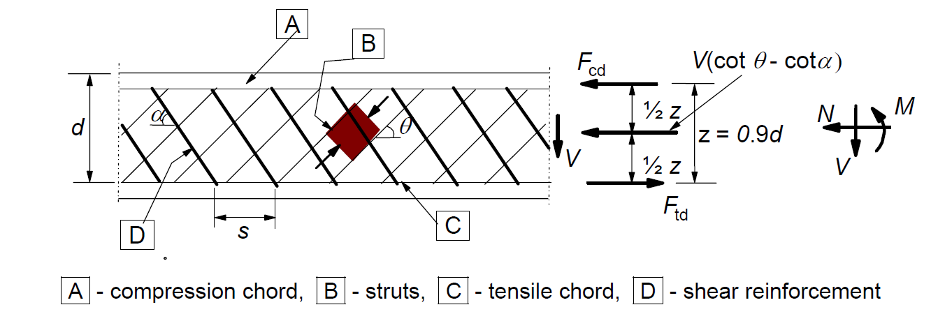 If the shear reinforcement is designed in the cross-section, shear can be resisted by a fictitious strut-and-model composed of stirrups, concrete struts, and longitudinal rebars.