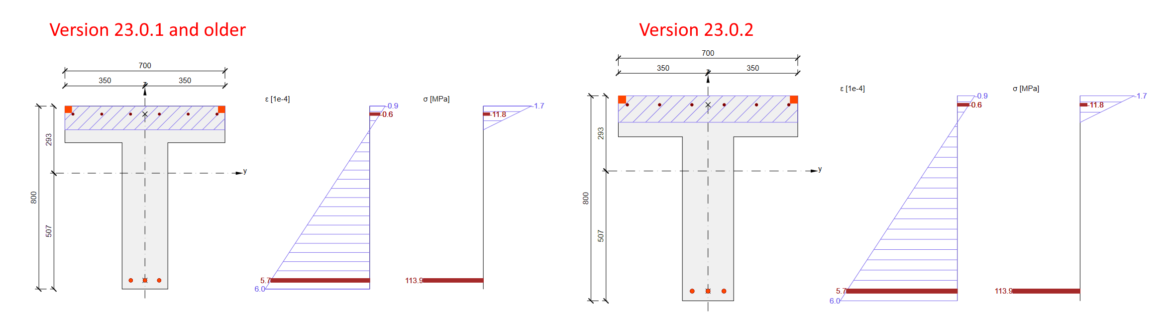 The cross-section is, in the first phase, loaded by a combination of normal force and bending moments N-My-Mz. The results comparison between the software versions provides us with the same results.